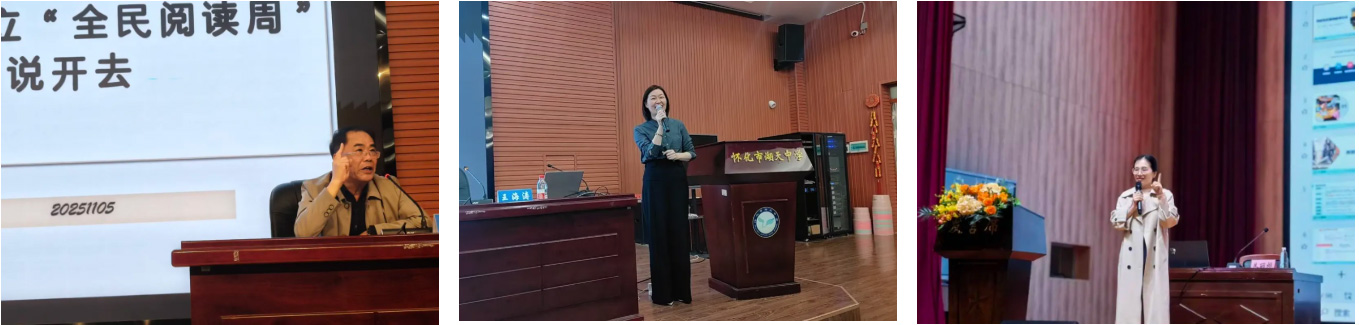 11月5日,梦飞翔项目顾问王曙良、双峰县阅读督导员王海涛和朱丽娜、同事张钰,赴怀化市宏宇小学和湖天中学,开展全市阅读教育种子教师专项交流。此次活动由怀化市教育局统筹,14个县市区教育局代表及38所学校种子教师共700余人参与。活动按学段分场,小学场在宏宇小学由朱丽娜主讲,中学场在湖天中学由王曙良和王海涛联合授课,内容聚焦阅读教育理念与项目实操,交流效果良好。